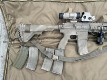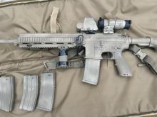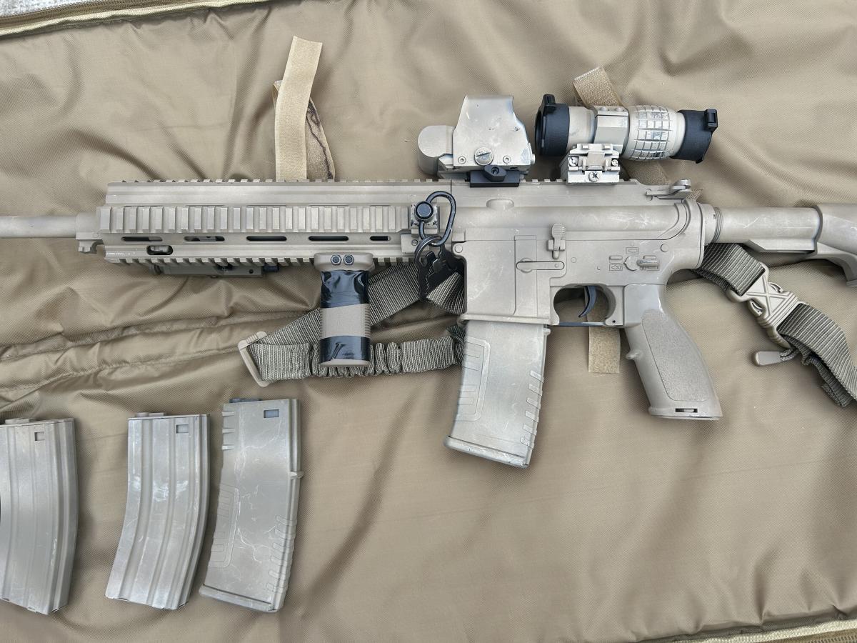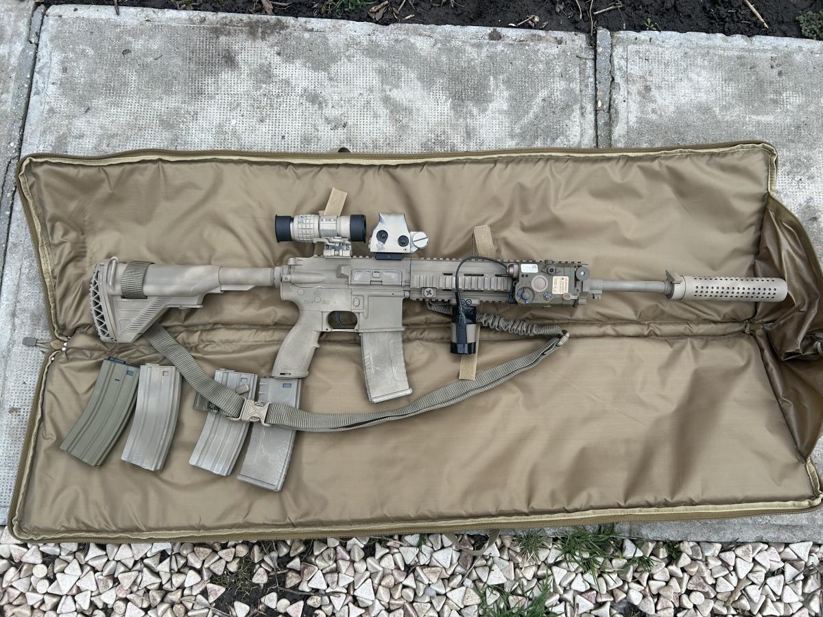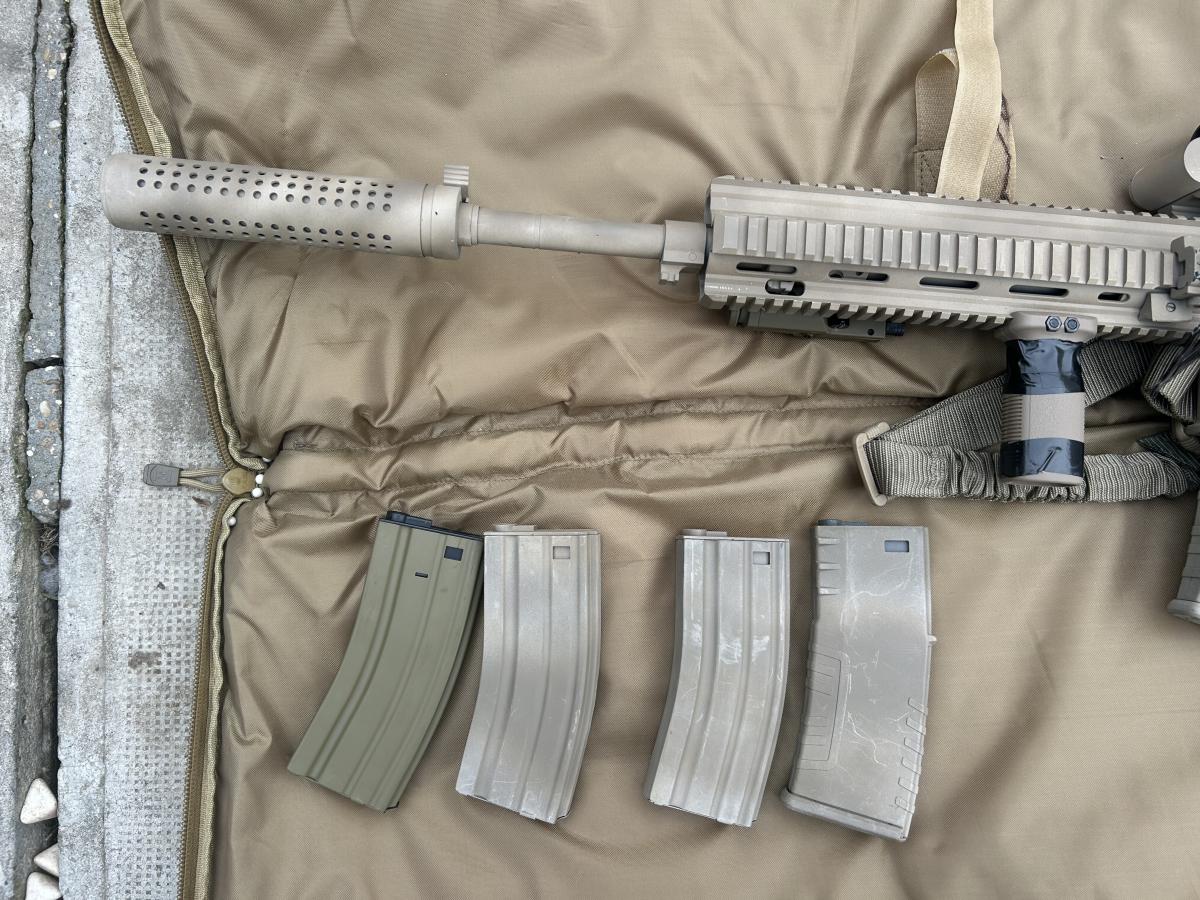 Eladó teljesen fém AEG egyedi festéssel a képeken látható kiegészítőkkel ! Csak használni kel ! Guerilla Red Dot és 3x35 távcső , PEQ15 , hangtompító , USMC fegyverszíj , tartalék tárak, fehyvertáska