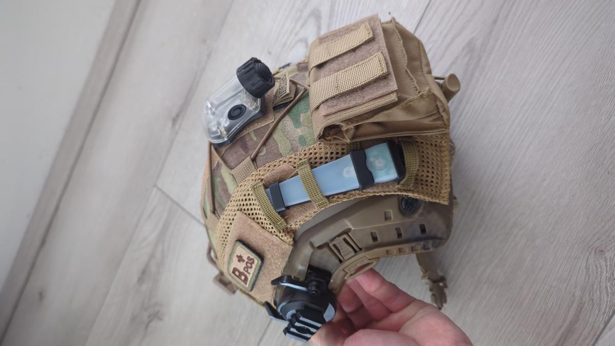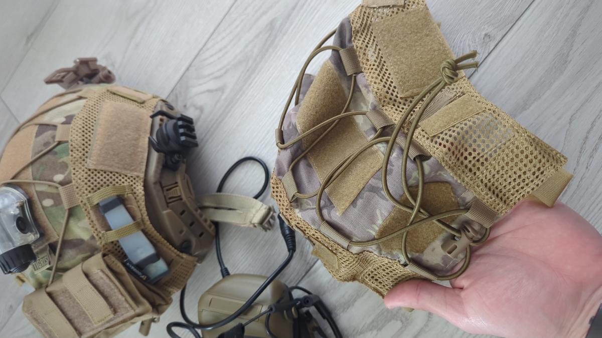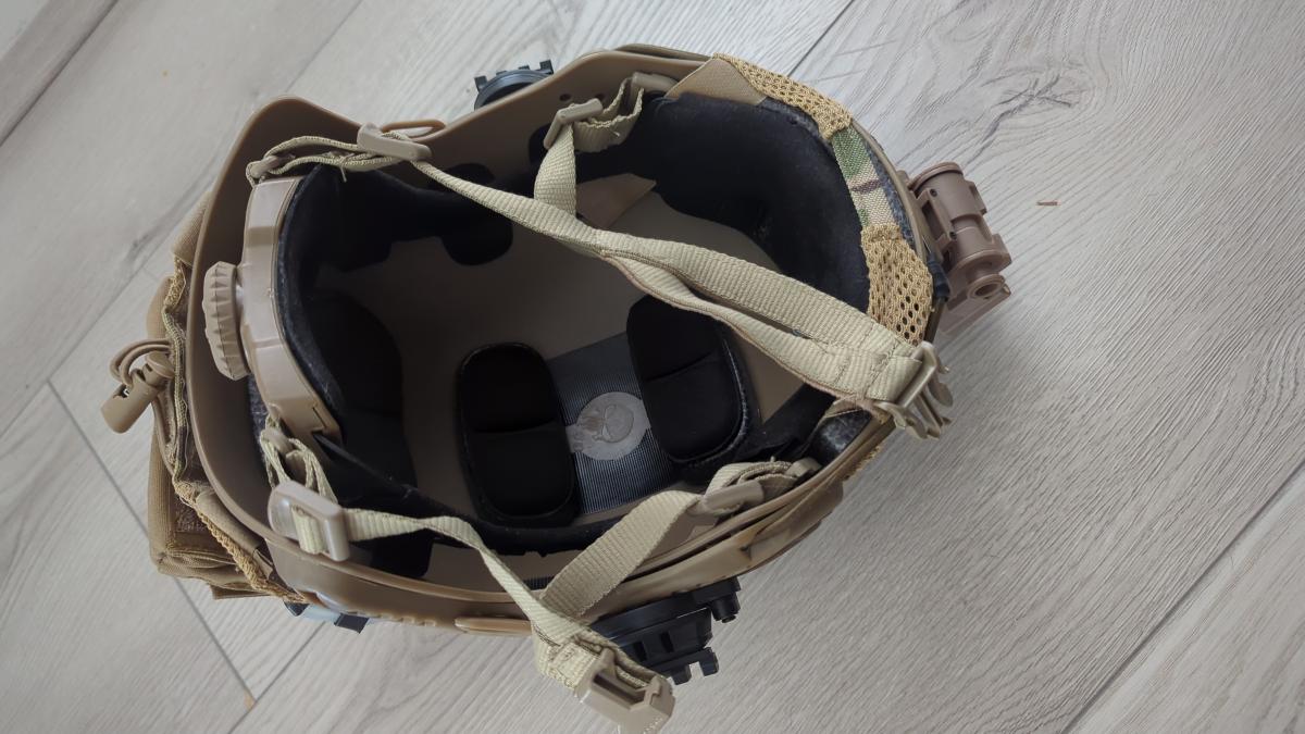 Fast sisak, Multicam sisakhuzat + extra sisakhuzat, "IR" strobe, 2 talalatjelzo, akksi pouch, nvg mount, fules rogzito adapterek. (b+ patch nem)