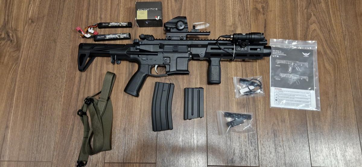 A puskában cseréltem belső csövet Guarder 6,02 mm -re, Modify Hopup gumit és Flat lenyomót kapott. A puskához tartozik a magasítóra helyezett Victoptics Red Dot, egy Flash light illetve egy kiegészítő grip.