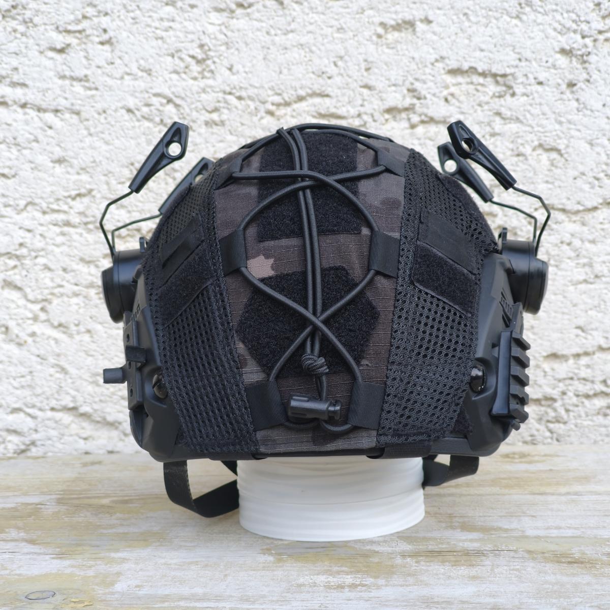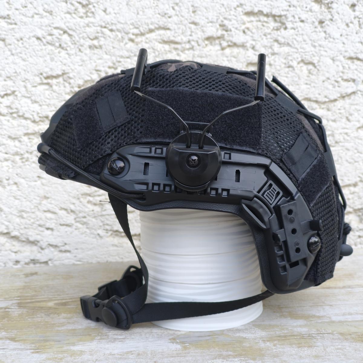 Kihasználatlanság miatt eladó fekete PJ sisak multicam black huzattal, füles-tartókkal.