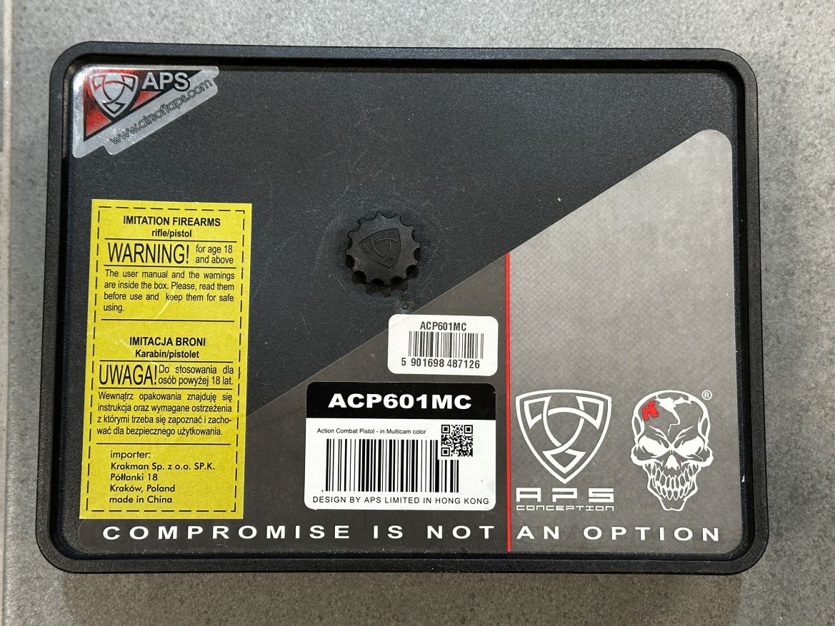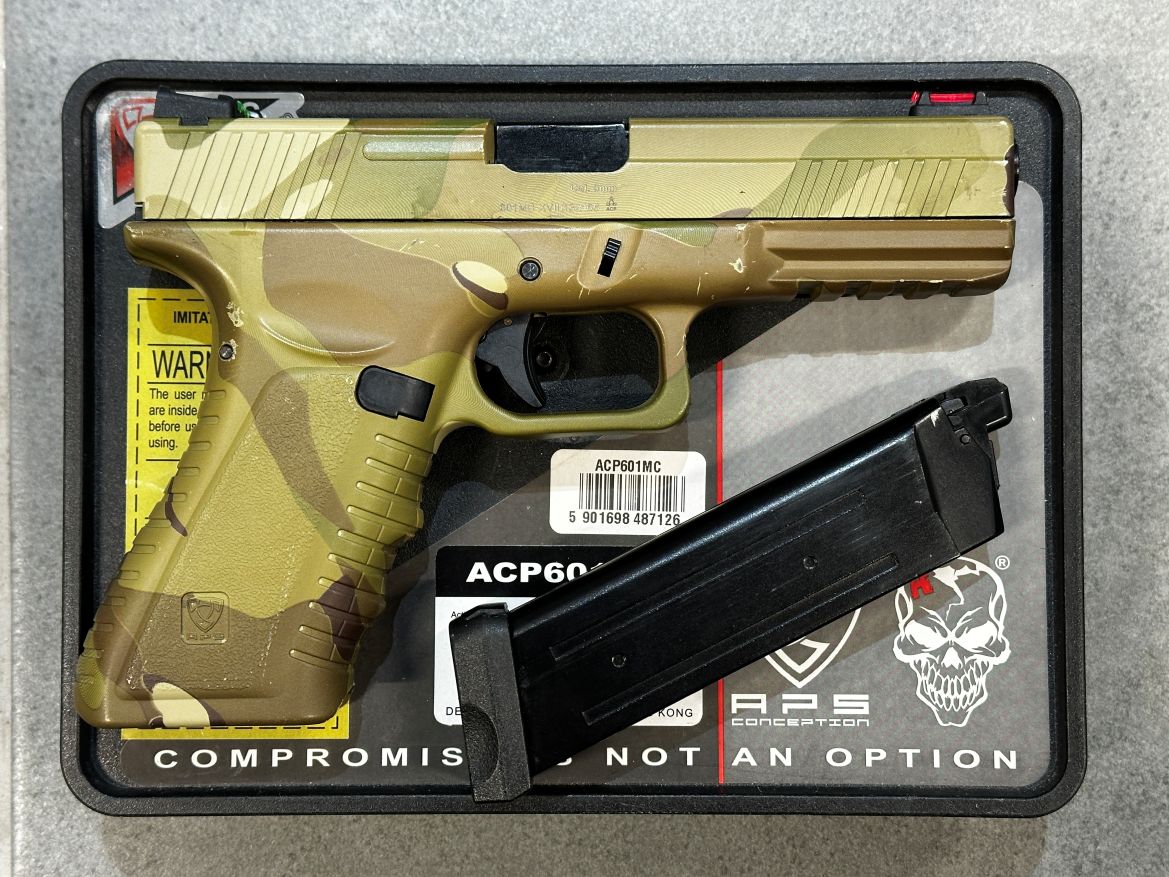 Eladó egy APS ACP601MC CO2 GBB pisztoly fém szánnal Multicam színben tan színű tokkal együtt. A replika játékon nem járt csak céllövészetre volt használva.