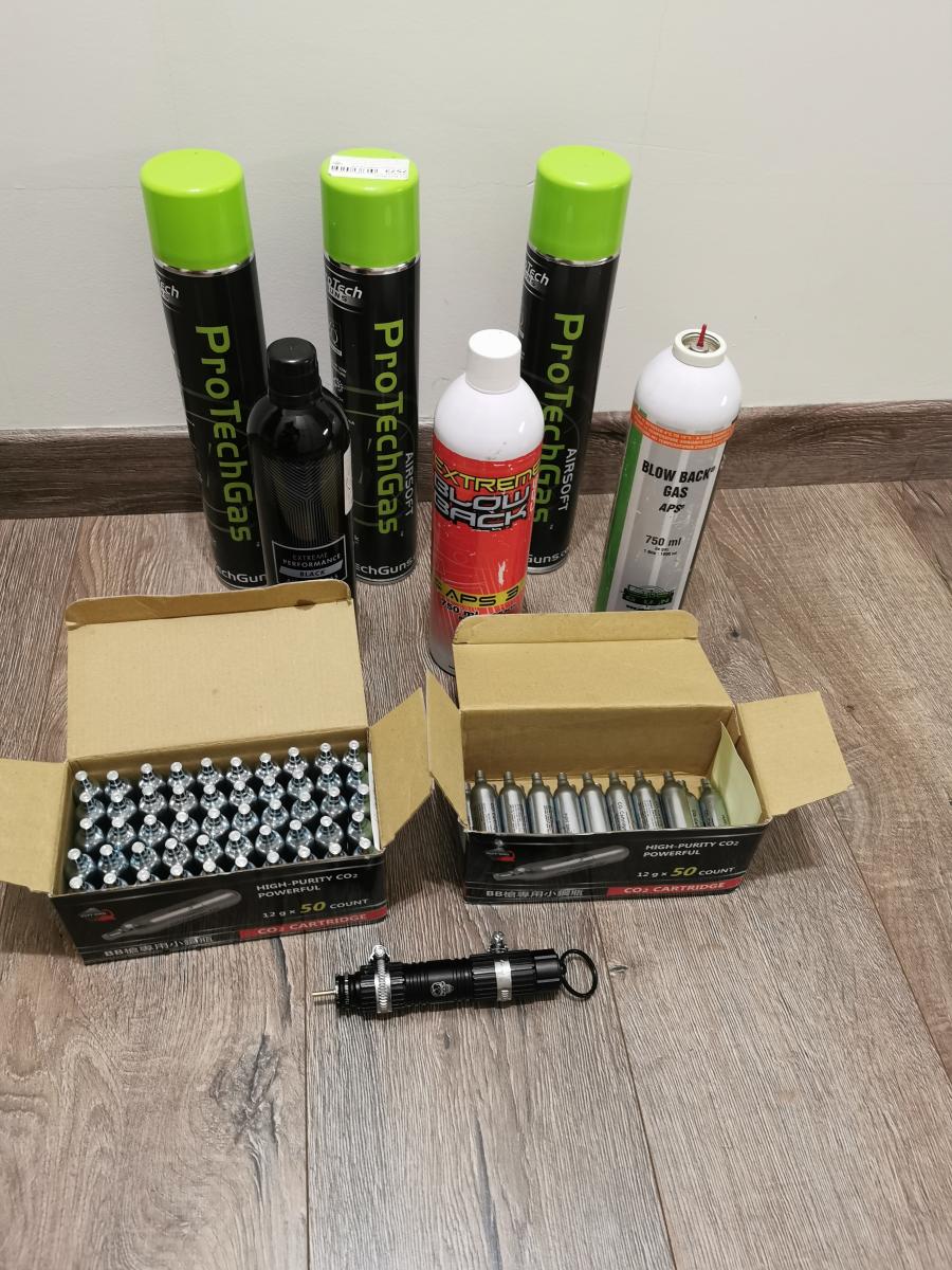 Eladó 3db Green gas 1000ml 2teli 1-ben kevés van , Nimrod Black gas 500ml kb ¾-ig van , APS 3 Red gas 750ml kb félig van , 68db CO patron , 1db nem tudom milyen gáz (valami utántöltött) , 1db CO adapter.