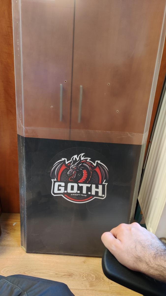 Eladó airsoft pajzs 1200x600 mm méretben. A pajzs alapállapotban víztiszta, átlátszó. Tartozik hozzá fogantyú (jobb és balkezes is) illetve heveder, hogy a karoddal kényelmesen tartható legyen.