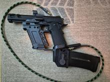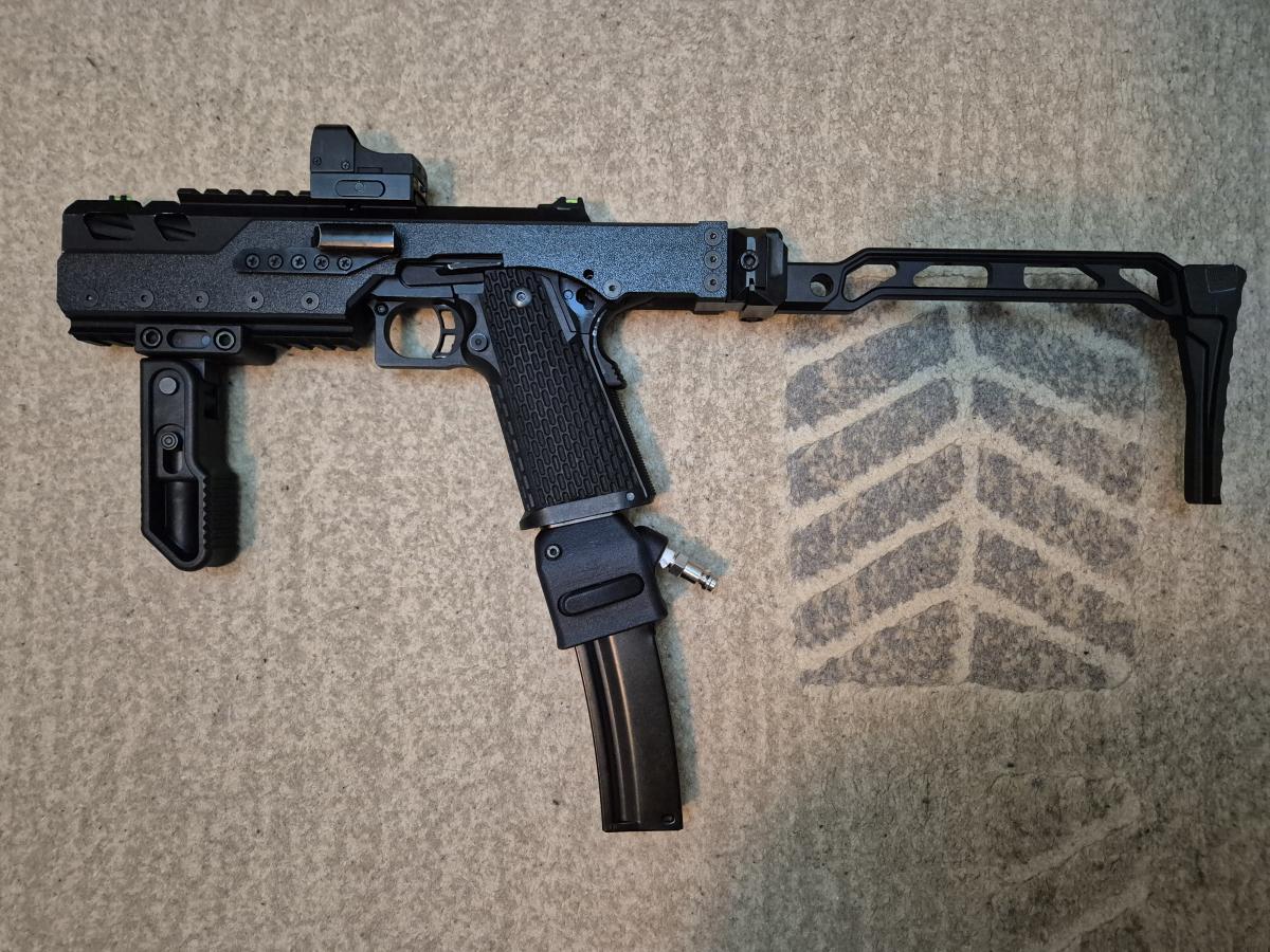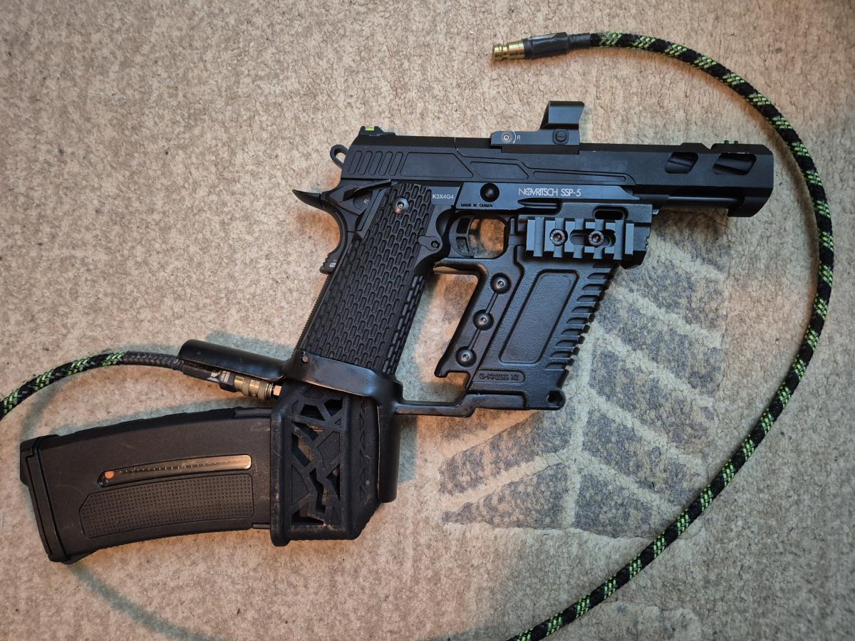 Egy saját tervezésű, és nyomtatású kit. (eSun ABS+ anyagból készült egy Bambulab P1S nyomtatón, nem fog eltörni, ha lejtik, ha meglövik). A Novritsch gyorstok adapter ami rajta van, hosszabb csavarokkal a pisztolyba van belerögzítve, így betonstabilan áll. A kitre került még egy 5KU „Curved Folding Skeleton Stock” és egy D-Day „Vertical Folding Grip”, így tudtam sniper mellé másodlagosnak is használni.