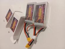 A felirat szerint 7,4V 1000mAh, semennyit nem voltak használva. XT-30 csati van rajta.