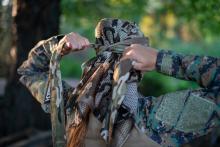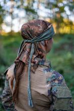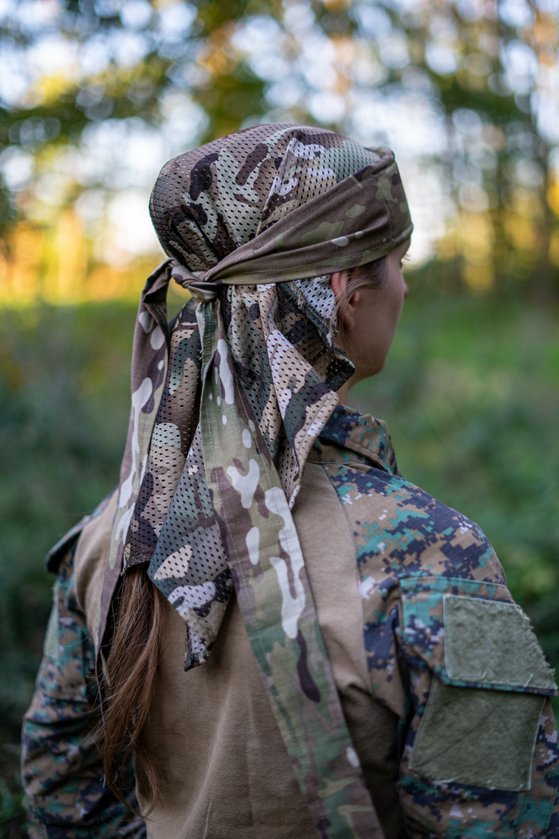 - A teljes fejet fedő terepmintás hálózat fokozott álcázást biztosít, megtörve a fej kontúrját.
