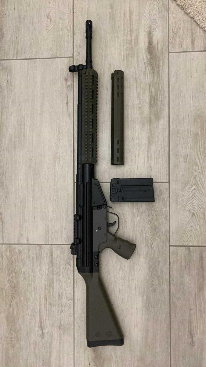 Eladó a címben említett ABS testes JG G3 replika saját dobozában, 1db high cap tárral, red dot szerelékkel + 3D nyomtatott RIS előaggyal (PLA). A GB gyors rugócserés, 380-390 között lő beállított hoppal.