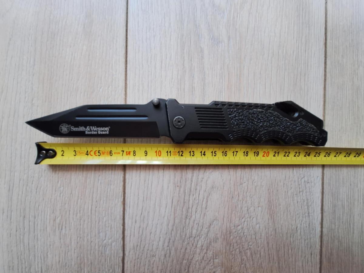 Eladó a képeken látható Smith & Wesson® Border Guard kés. Tanto pengével, kétoldalas hüvelykujj-gombokkal és kettős vércsatornákkal, fekete alumínium markolata track tech betétekkel, üvegtörő eszközzel, zsinórlyukkal, hevedervágóval és zsebcsipesszel rendelkezik.